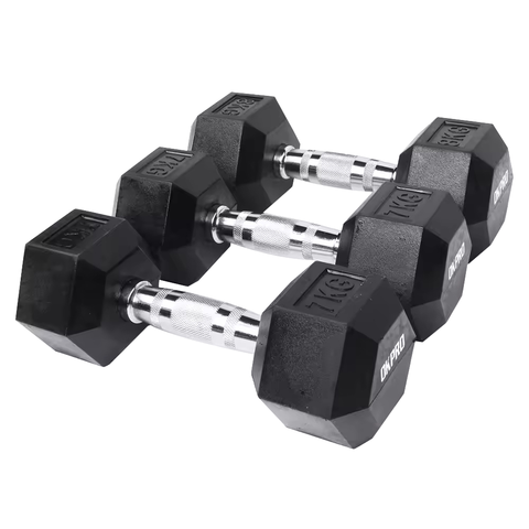 Mancuernas hexagonales de alta calidad de 40kg y 2kg Juego de mancuernas hexagonales de goma populares con etiquetas de 2Kg y 40kg